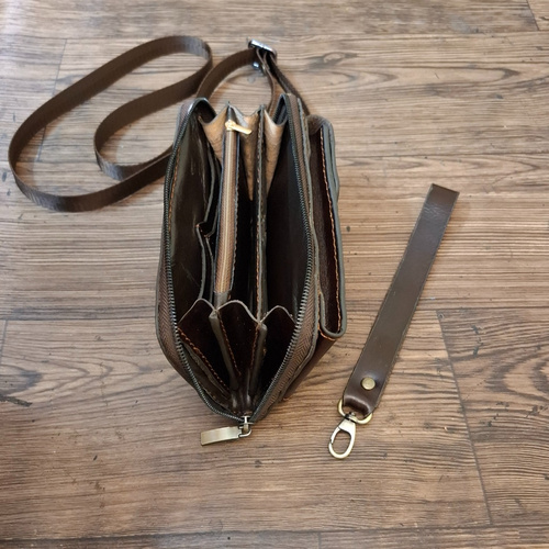 کیف پول دور زیپ دار چرمی مدل یاس کد 484.2 از چرم طبیعی گاوی وبصورت دست دوز تهیه شده است. این کیف زیبا وجا دار مناسب حمل مدارک است ودارای چندین محفظه کارت(8) می باشد .این کیف دارای بند کوتاه مچی حدود 45 سانت و بند بلند 1/10 متری قابل تنظیم می باشد . در نمای کیف یک محفظه ویژه موبایل تعبیه شده که به وسیله دکمه بازو وبسته می شود .این کیف جادار مناسب استفاده روزمره برای کسانی است که علاقه به سبک بودن دارند ونمیخواهند از کیفهای بزرگ استفاده کنند